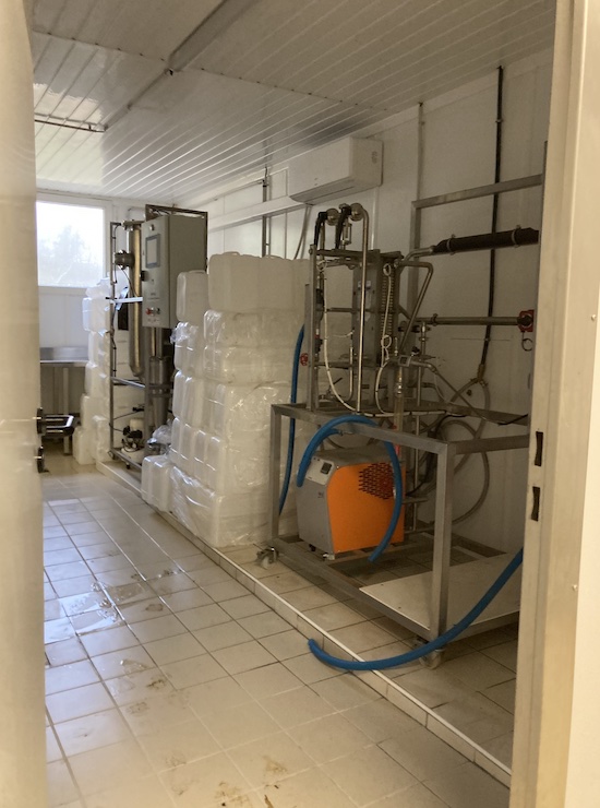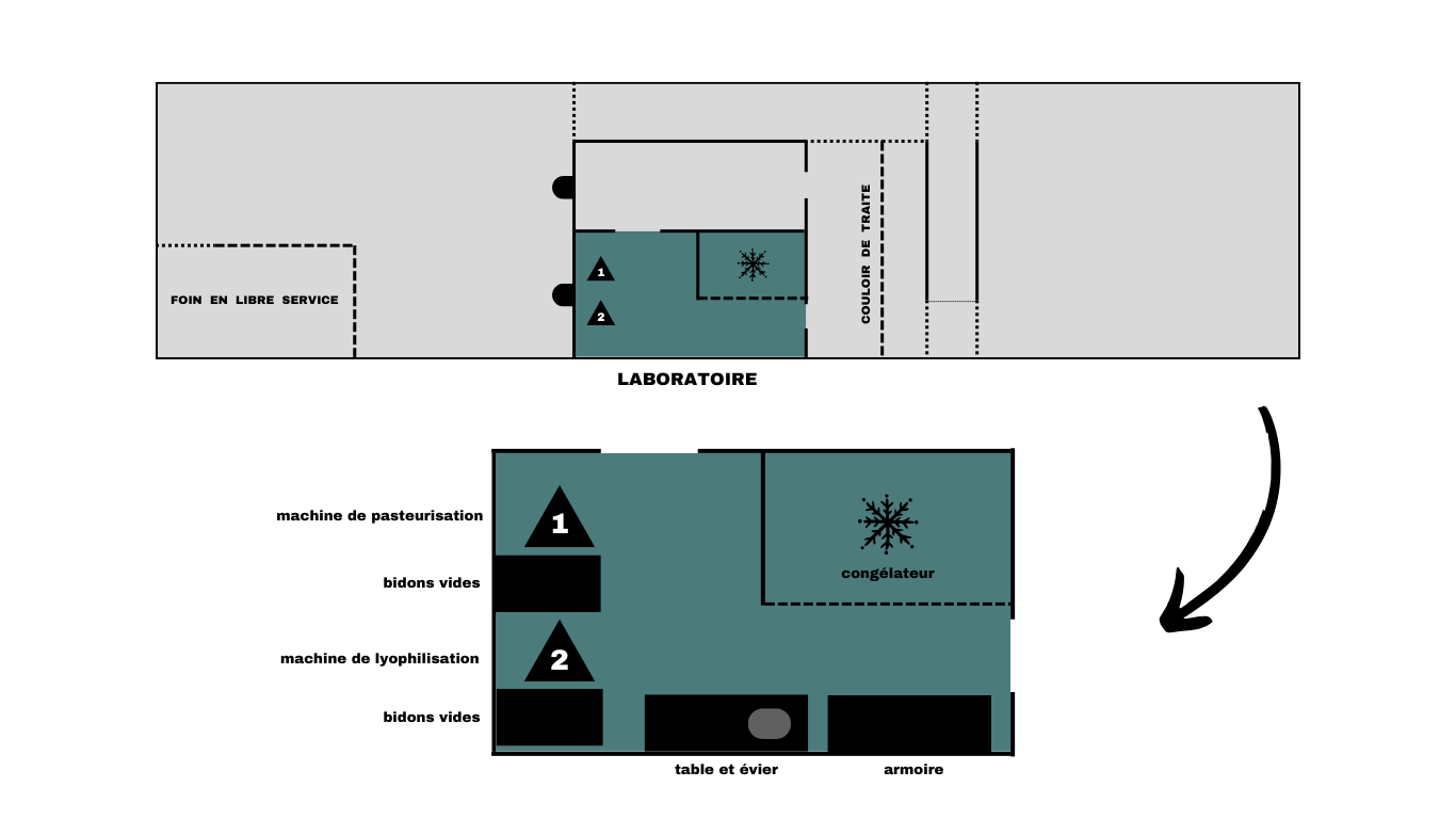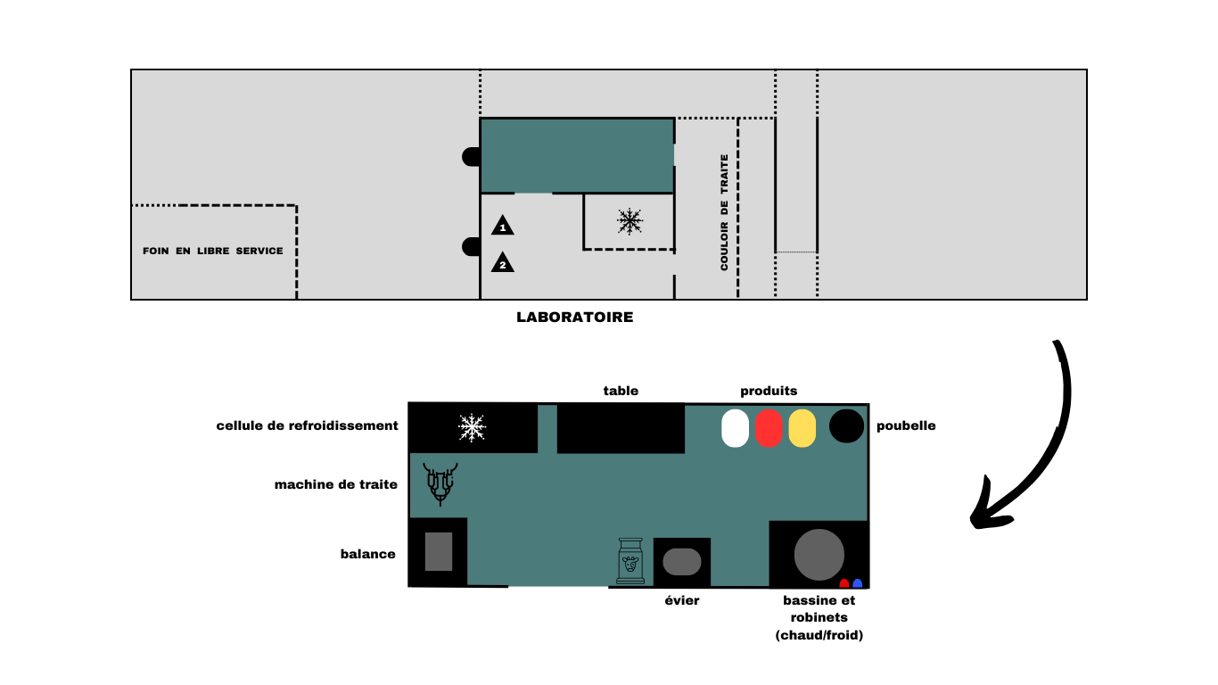 Le bâtiment comprend un laboratoire réparti en deux pièces, dédié au traitement du lait, à sa conservation, ainsi qu’au rangement de la machine et des appareils d’entretien.