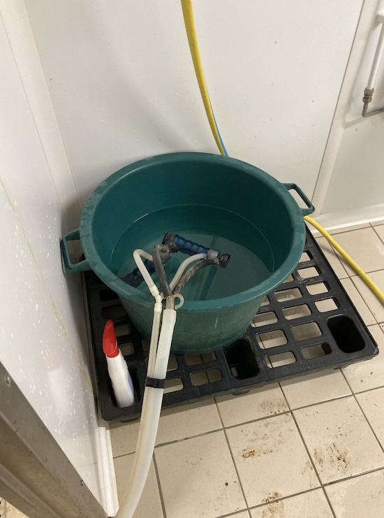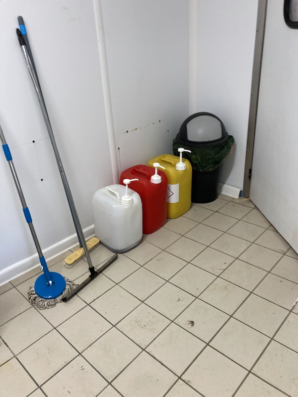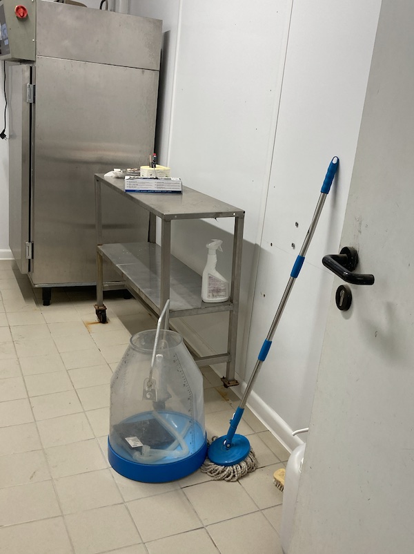 Le laboratoire est nettoyé et désinfecté chaque jour. Pour ce faire, on passe un jet d’eau dans lequel on a préalablement dilué l’un des trois produits, puis on nettoie à l’éponge les zones sensibles de la pièce, notamment les jointures.