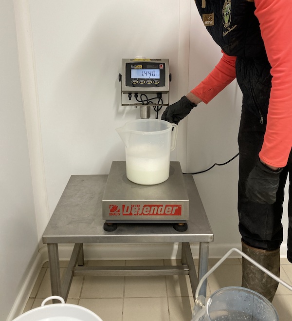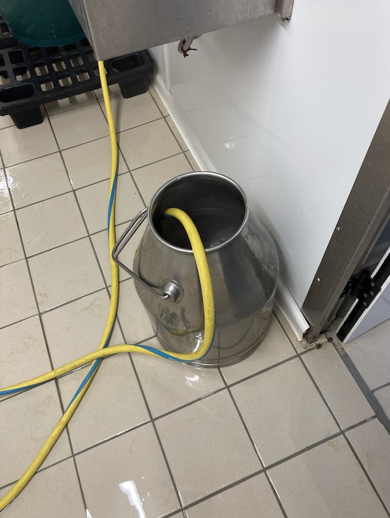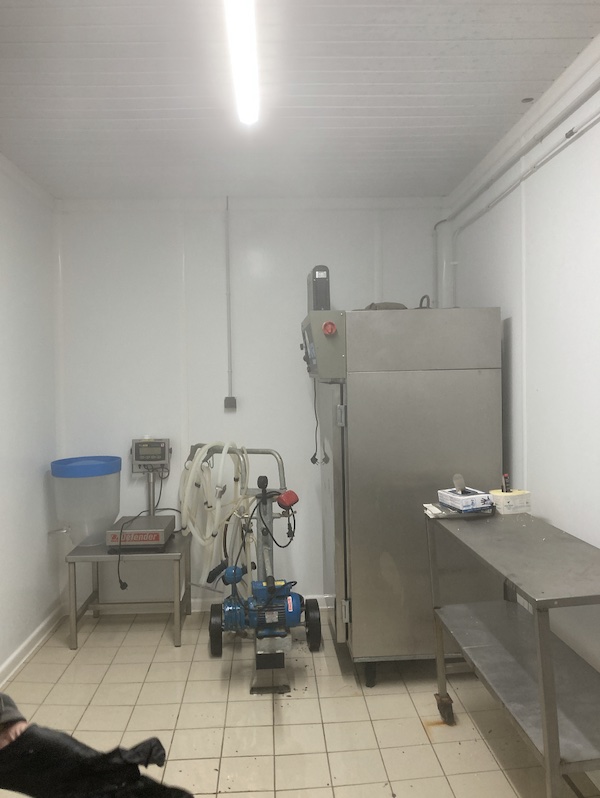Dans la première pièce, se trouve le matériel nécessaire à la pesée : une balance, un petit évier équipé d’un bouton actionnable au pied, une grande bassine munie de deux robinets pour l’eau chaude et froide, les trois produits d’entretien et une poubelle. On y trouve également une table, une cellule de refroidissement et, bien entendu, la machine de traite.
