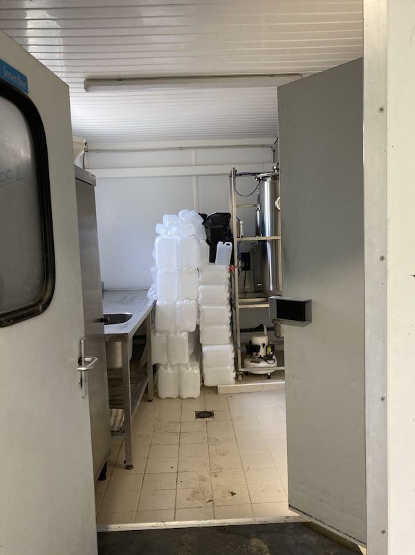 La deuxième pièce du laboratoire sert principalement de lieu de stockage. On y trouve des bidons vides destinés à recevoir le lait pour transformation, un tableau équipé d’un évier, une armoire et un grand congélateur. Deux machines y sont installées : l’une pour la pasteurisation, afin d’éliminer germes et bactéries présents dans le lait récolté et pesé, et l’autre pour la lyophilisation, qui transforme le lait en poudre. Les bidons contenant le lait frais et pesé sont stockés dans le congélateur, accompagnés d’une étiquette garantissant une traçabilité optimale.